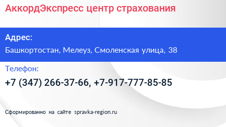 АккордЭкспресс, центр страхования по адресу Башкортостан, Мелеуз, Смоленская улица, 38 в дальнейшем Организация, размещена в следующих категориях: