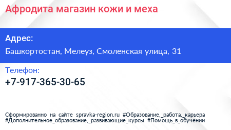 Афродита, магазин кожи и меха по адресу Башкортостан, Мелеуз, Смоленская улица, 31 в дальнейшем Организация, размещена в следующих категориях: