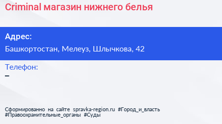 Criminal, магазин нижнего белья по адресу Башкортостан, Мелеуз, Шлычкова, 42 в дальнейшем Организация, размещена в следующих категориях: