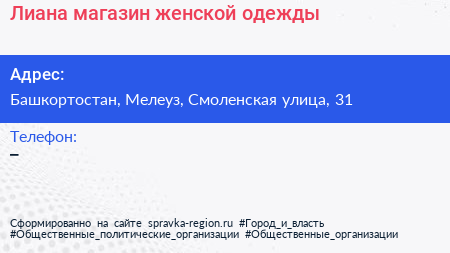 Лиана, магазин женской одежды по адресу Башкортостан, Мелеуз, Смоленская улица, 31 в дальнейшем Организация, размещена в следующих категориях: