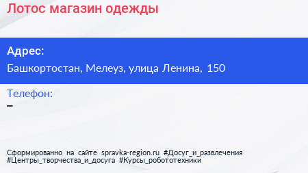 Лотос, магазин одежды по адресу Башкортостан, Мелеуз, улица Ленина, 150 в дальнейшем Организация, размещена в следующих категориях: