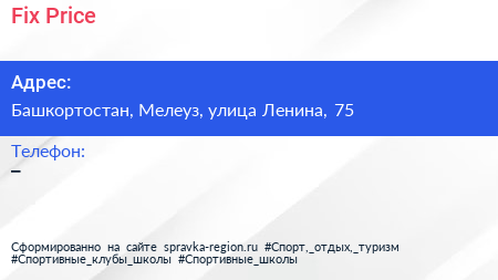 Fix Price по адресу Башкортостан, Мелеуз, улица Ленина, 75 в дальнейшем Организация, размещена в следующих категориях: