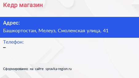 Кедр, магазин по адресу Башкортостан, Мелеуз, Смоленская улица, 41 в дальнейшем Организация, размещена в следующих категориях: