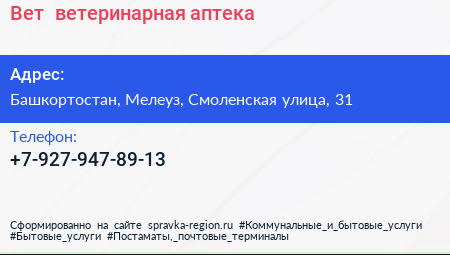 Вет+, ветеринарная аптека по адресу Башкортостан, Мелеуз, Смоленская улица, 31 в дальнейшем Организация, размещена в следующих категориях: