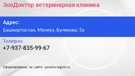 ЗооДоктор, ветеринарная клиника по адресу Башкортостан, Мелеуз, Булякова, 5а в дальнейшем Организация, размещена в следующих категориях: