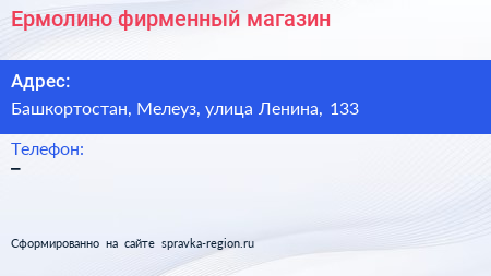 Ермолино, фирменный магазин по адресу Башкортостан, Мелеуз, улица Ленина, 133 в дальнейшем Организация, размещена в следующих категориях: