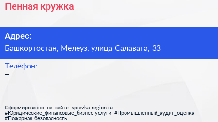 Пенная кружка по адресу Башкортостан, Мелеуз, улица Салавата, 33 в дальнейшем Организация, размещена в следующих категориях: