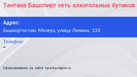 Тантана-Башспирт, сеть алкогольных бутиков по адресу Башкортостан, Мелеуз, улица Ленина, 133 в дальнейшем Организация, размещена в следующих категориях: