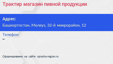 Трактир, магазин пивной продукции по адресу Башкортостан, Мелеуз, 32-й микрорайон, 12 в дальнейшем Организация, размещена в следующих категориях: