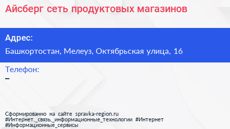 Айсберг, сеть продуктовых магазинов по адресу Башкортостан, Мелеуз, Октябрьская улица, 16 в дальнейшем Организация, размещена в следующих категориях: