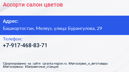 Ассорти, салон цветов по адресу Башкортостан, Мелеуз, улица Бурангулова, 29 в дальнейшем Организация, размещена в следующих категориях: