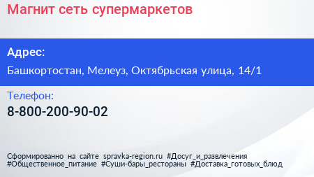 Магнит, сеть супермаркетов по адресу Башкортостан, Мелеуз, Октябрьская улица, 14/1 в дальнейшем Организация, размещена в следующих категориях: