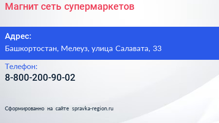 Магнит, сеть супермаркетов по адресу Башкортостан, Мелеуз, улица Салавата, 33 в дальнейшем Организация, размещена в следующих категориях:
