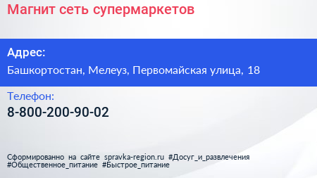 Магнит, сеть супермаркетов по адресу Башкортостан, Мелеуз, Первомайская улица, 18 в дальнейшем Организация, размещена в следующих категориях: