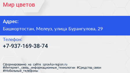 Мир цветов по адресу Башкортостан, Мелеуз, улица Бурангулова, 29 в дальнейшем Организация, размещена в следующих категориях: