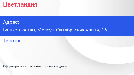 Цветландия по адресу Башкортостан, Мелеуз, Октябрьская улица, 16 в дальнейшем Организация, размещена в следующих категориях: