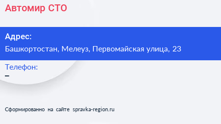 Автомир, СТО по адресу Башкортостан, Мелеуз, Первомайская улица, 23 в дальнейшем Организация, размещена в следующих категориях:
