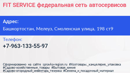 FIT SERVICE, федеральная сеть автосервисов по адресу Башкортостан, Мелеуз, Смоленская улица, 198 ст9 в дальнейшем Организация, размещена в следующих категориях: