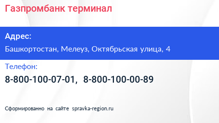 Газпромбанк, терминал по адресу Башкортостан, Мелеуз, Октябрьская улица, 4 в дальнейшем Организация, размещена в следующих категориях: