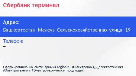 Сбербанк, терминал по адресу Башкортостан, Мелеуз, Сельскохозяйственная улица, 19 в дальнейшем Организация, размещена в следующих категориях:
