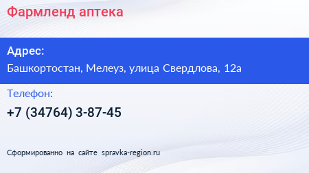 Фармленд, аптека по адресу Башкортостан, Мелеуз, улица Свердлова, 12а в дальнейшем Организация, размещена в следующих категориях: