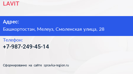 LAVIT по адресу Башкортостан, Мелеуз, Смоленская улица, 28 в дальнейшем Организация, размещена в следующих категориях:
