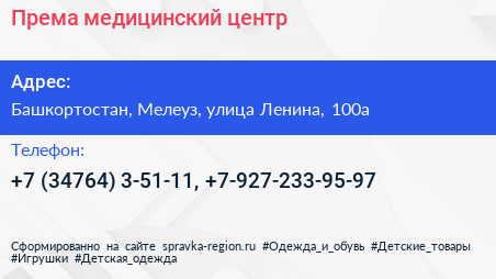 Према, медицинский центр по адресу Башкортостан, Мелеуз, улица Ленина, 100а в дальнейшем Организация, размещена в следующих категориях: