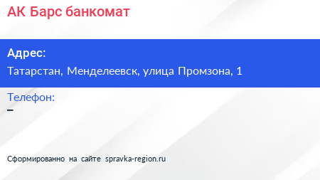 АК Барс, банкомат по адресу Татарстан, Менделеевск, улица Промзона, 1 в дальнейшем Организация, размещена в следующих категориях: