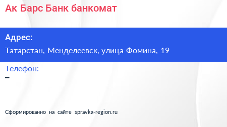 Ак Барс Банк, банкомат по адресу Татарстан, Менделеевск, улица Фомина, 19 в дальнейшем Организация, размещена в следующих категориях: