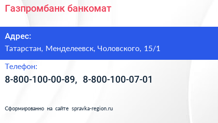 Газпромбанк, банкомат по адресу Татарстан, Менделеевск, Чоловского, 15/1 в дальнейшем Организация, размещена в следующих категориях: