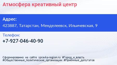 Атмосфера, креативный центр по адресу 423887, Татарстан, Менделеевск, Ильичевская, 9 в дальнейшем Организация, размещена в следующих категориях: