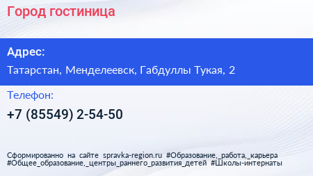Город, гостиница по адресу Татарстан, Менделеевск, Габдуллы Тукая, 2 в дальнейшем Организация, размещена в следующих категориях: