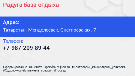 Радуга, база отдыха по адресу Татарстан, Менделеевск, Снегирёвская, 7 в дальнейшем Организация, размещена в следующих категориях:
