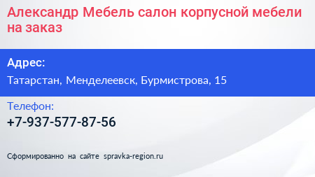 Александр Мебель, салон корпусной мебели на заказ по адресу Татарстан, Менделеевск, Бурмистрова, 15 в дальнейшем Организация, размещена в следующих категориях: