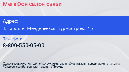 МегаФон, салон связи по адресу Татарстан, Менделеевск, Бурмистрова, 15 в дальнейшем Организация, размещена в следующих категориях: