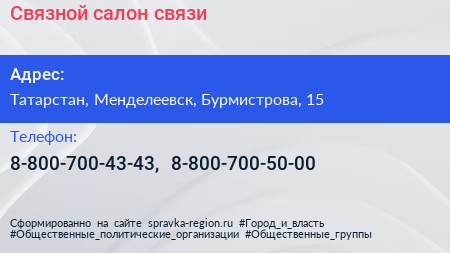 Связной, салон связи по адресу Татарстан, Менделеевск, Бурмистрова, 15 в дальнейшем Организация, размещена в следующих категориях:
