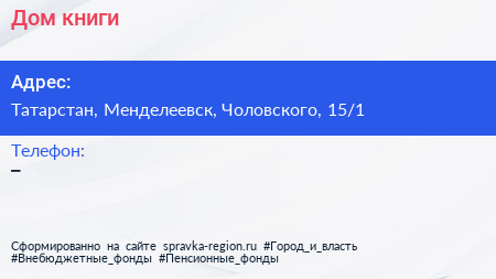 Дом книги по адресу Татарстан, Менделеевск, Чоловского, 15/1 в дальнейшем Организация, размещена в следующих категориях: