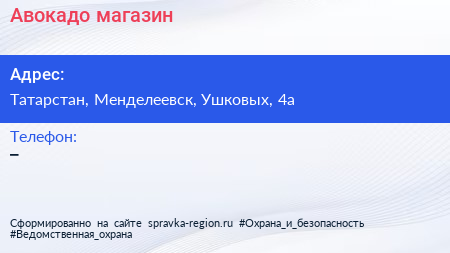 Авокадо, магазин по адресу Татарстан, Менделеевск, Ушковых, 4а в дальнейшем Организация, размещена в следующих категориях: