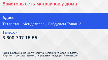 Бристоль, сеть магазинов у дома по адресу Татарстан, Менделеевск, Габдуллы Тукая, 2 в дальнейшем Организация, размещена в следующих категориях: