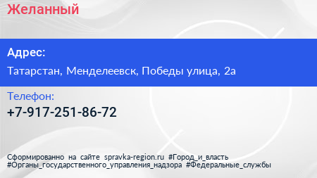 Желанный по адресу Татарстан, Менделеевск, Победы улица, 2а в дальнейшем Организация, размещена в следующих категориях: