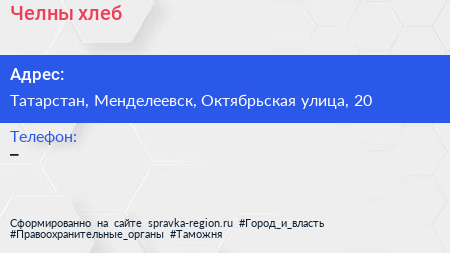 Челны хлеб по адресу Татарстан, Менделеевск, Октябрьская улица, 20 в дальнейшем Организация, размещена в следующих категориях: