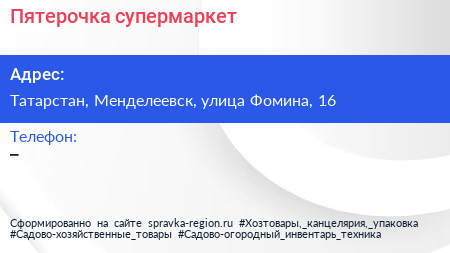 Пятерочка, супермаркет по адресу Татарстан, Менделеевск, улица Фомина, 16 в дальнейшем Организация, размещена в следующих категориях: