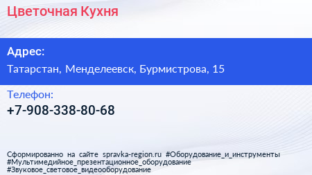 Цветочная Кухня по адресу Татарстан, Менделеевск, Бурмистрова, 15 в дальнейшем Организация, размещена в следующих категориях: