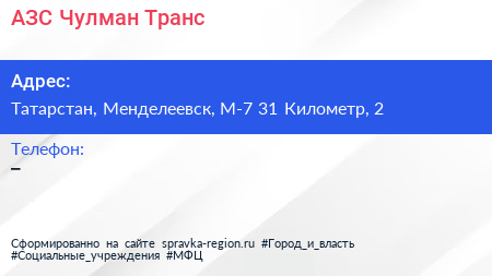 АЗС, Чулман-Транс по адресу Татарстан, Менделеевск, М-7 31 Километр, 2 в дальнейшем Организация, размещена в следующих категориях: