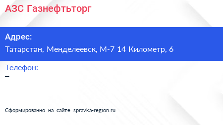 АЗС, Газнефтьторг по адресу Татарстан, Менделеевск, М-7 14 Километр, 6 в дальнейшем Организация, размещена в следующих категориях: