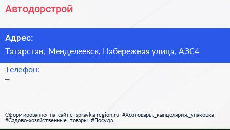 Автодорстрой по адресу Татарстан, Менделеевск, Набережная улица, АЗС4 в дальнейшем Организация, размещена в следующих категориях: