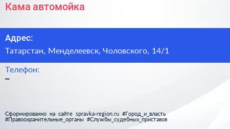 Кама, автомойка по адресу Татарстан, Менделеевск, Чоловского, 14/1 в дальнейшем Организация, размещена в следующих категориях: