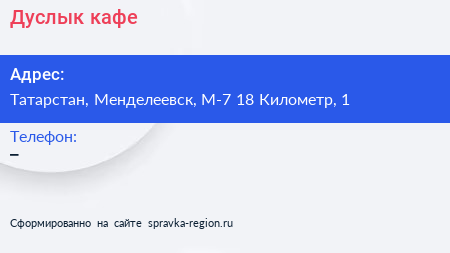 Дуслык, кафе по адресу Татарстан, Менделеевск, М-7 18 Километр, 1 в дальнейшем Организация, размещена в следующих категориях: