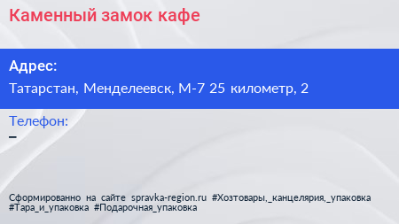 Каменный замок, кафе по адресу Татарстан, Менделеевск, М-7 25 километр, 2 в дальнейшем Организация, размещена в следующих категориях: