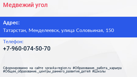 Медвежий угол по адресу Татарстан, Менделеевск, улица Соловьиная, 150 в дальнейшем Организация, размещена в следующих категориях: